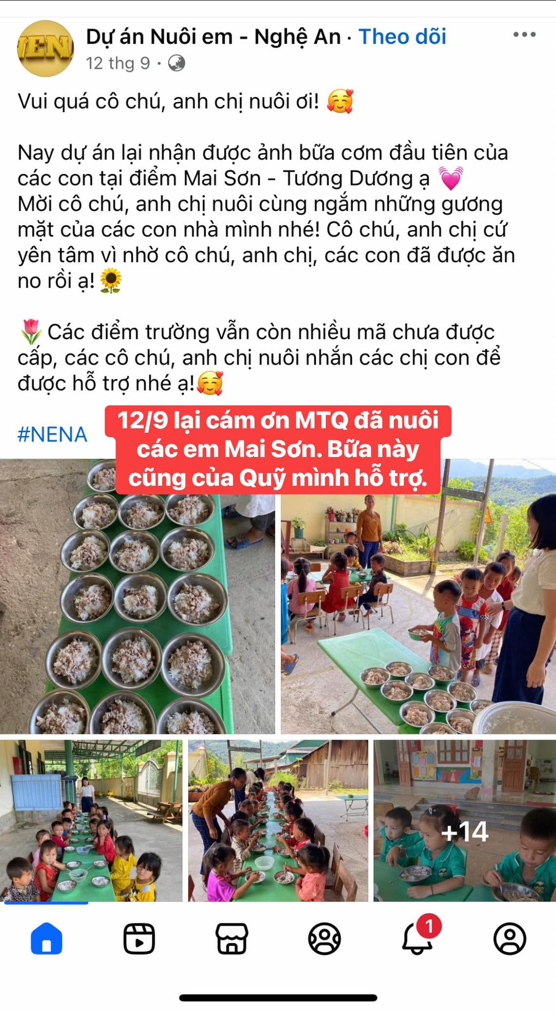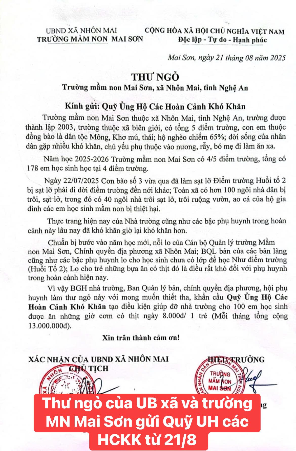 Theo chia sẻ của bà Vân Nguyễn Violet, sau trận lũ quét tại xã Nhôn Mai (Tương Dương cũ) – Nghệ An, Quỹ của bà cùng anh trai đã hỗ trợ bữa trưa có thịt cho 100 trẻ mầm non Trường Mai Sơn trong 2 tháng qua.