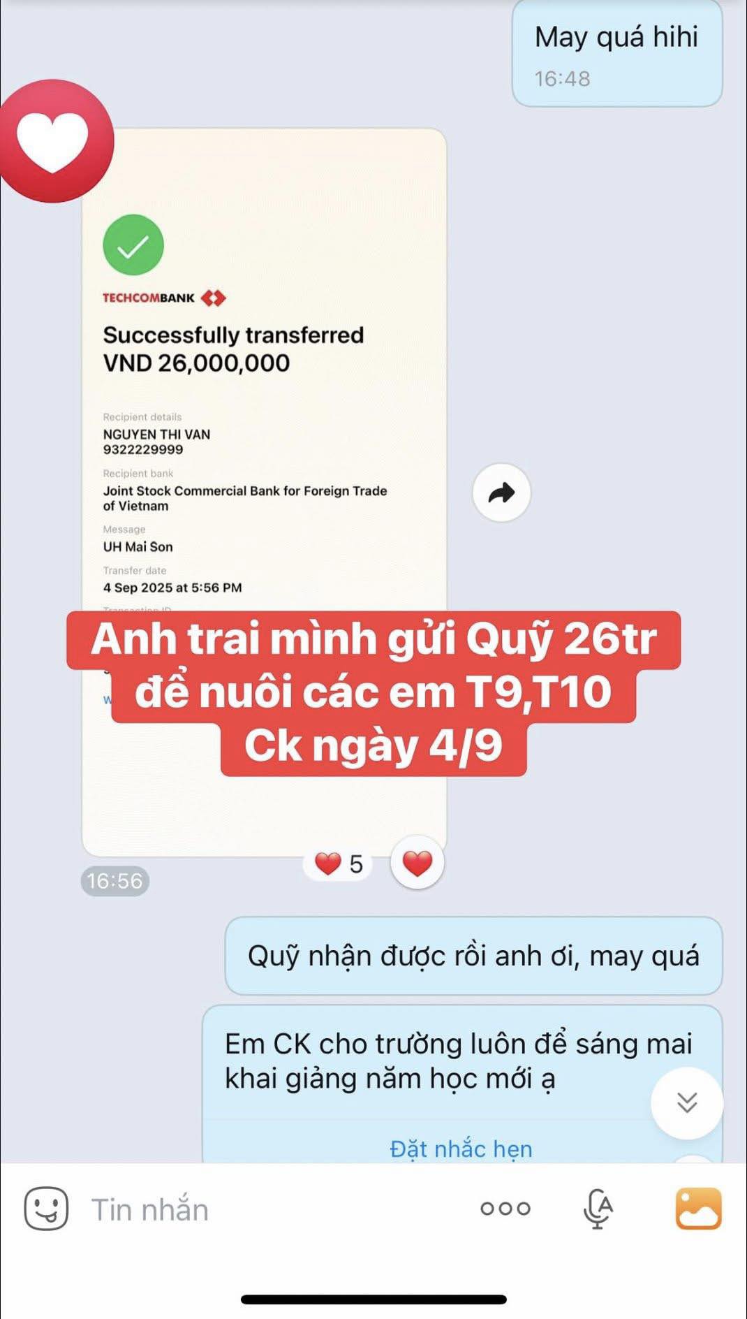 “Nhà trường xác nhận cả tháng 9 không nhận được một đồng nào từ Nuôi Em Nghệ An ở ba điểm trường. Mãi đến tuần 2 tháng 10, phía dự án mới liên hệ hỗ trợ nhưng vẫn chưa chuyển tiền,” bà Vân khẳng định.