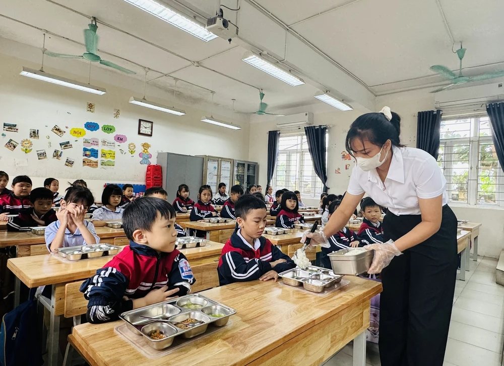 Học sinh Trường Tiểu học Chi Đông, Hà Nội ăn bán trú. Ảnh: Nguyễn Cúc-TTXVN