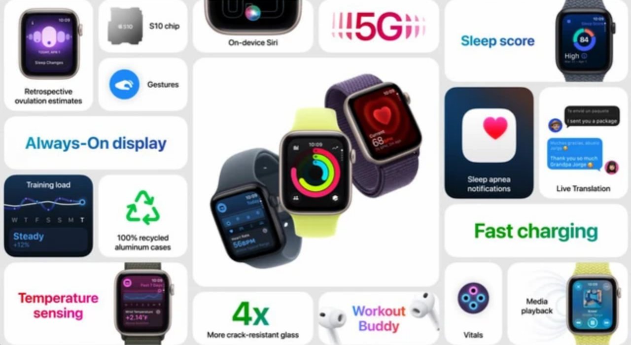 Apple cũng giới thiệu dòng Apple Watch Series 11. Phiên bản smartwatch mới nhất của Apple vẫn giữ những tính năng đã tạo thành thương hiệu. Đồng hồ sẽ đo đạc tuần hoàn máu, nhịp tim của người sử dụng liên tục và tổng kết báo cáo 7 ngày/lần cũng như cho phép người dùng cài đặt giờ ngủ.
