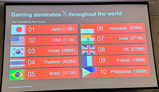 Theo dữ liệu nội bộ của X, mỗi ngày có hơn 20 triệu bài đăng liên quan đến game được tạo ra. Trong đó, Nhật Bản là quốc gia có lượng thảo luận cao nhất thế giới, vượt xa Mỹ dù thị trường Mỹ có số người dùng hoạt động lớn hơn. Thái Lan, Indonesia, Ấn Độ và Philippines cũng nằm trong nhóm các quốc gia có mức độ tương tác cực cao, phản ánh rõ sức sống của cộng đồng game thủ châu Á.