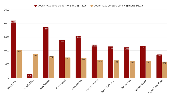 Tháng 2/2026, thị trường ô tô sử dụng động cơ đốt trong tại Việt Nam chứng kiến sự sụt giảm doanh số trên diện rộng.