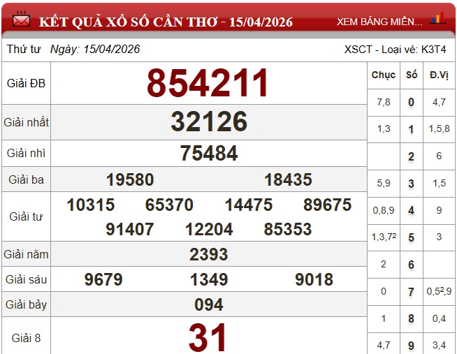 Kết quả xổ số Cần Thơ ngày 15/4/2026