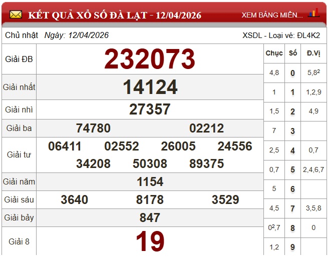 - XSDL 12/4, kết quả xổ số Đà Lạt ngày 12/4/2026