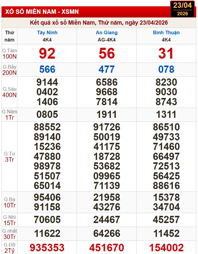 Kết quả xổ số miền Nam ngày 23/4/2026