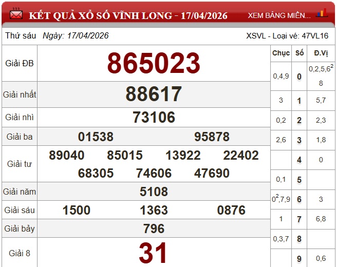 Kết quả xổ số Vĩnh Long Thứ Sáu ngày 17/4/2026