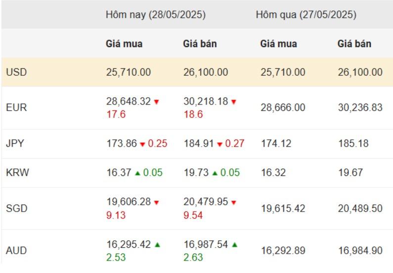 Nhìn chung, trong phiên giao dịch ngày 28/05/2025, phần lớn các đồng ngoại tệ đều giảm giá so với VND, ngoại trừ đồng AUD. Điều này phản ánh diễn biến tích cực của các đồng tiền mạnh trên thị trường quốc tế trong bối cảnh biến động kinh tế toàn cầu vẫn tiếp diễn.