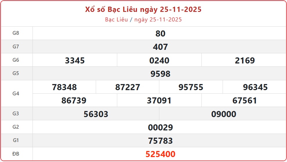 Kết quả xổ số Bạc Liêu thứ Ba ngày 25/11/2025