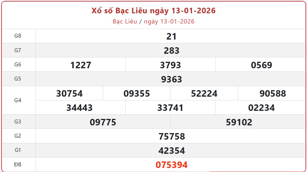 Kết quả xổ số Bạc Liêu thứ Ba ngày 13/1/2026