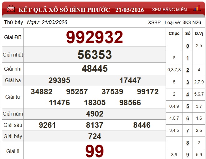 - XSBP 21/3, kết quả xổ số Bình Phước ngày 21/3/2026