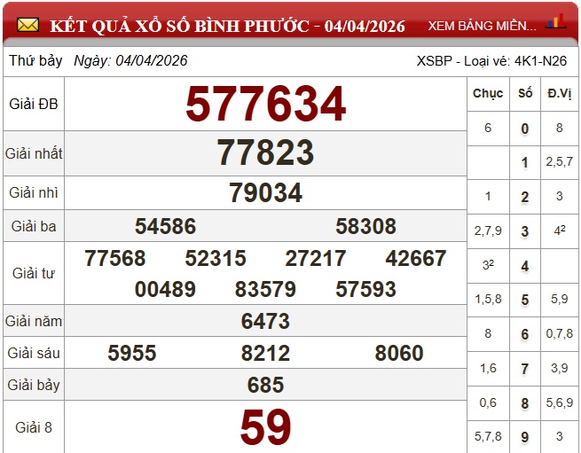 XSBP 4/4. Kết quả xổ số hôm nay ngày 4/4. XSBP Thứ Bảy. Trực tiếp KQXSBP ngày 4/4. Kết quả xổ số Bình Phước hôm nay ngày 4/4/2026.