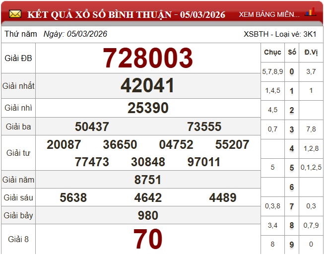 Trực tiếp Kết quả xổ số Bình Thuận hôm nay - Kết quả XSBTH 12/3 - XSBTH hôm nay Thứ Năm ngày 12/3/2026 - Xổ số Bình Thuận hôm nay - Trực tiếp xổ số Bình Thuận hôm nay