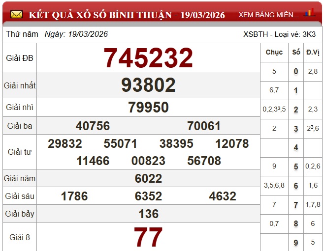 Kết quả xổ số Bình Thuận Thứ Năm ngày 19/3/2026