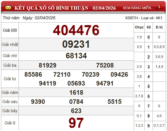 Hãy theo dõi kết quả xổ số Bình Thuận hôm nay 9/4/2026 để cập nhật kết quả sớm nhất.