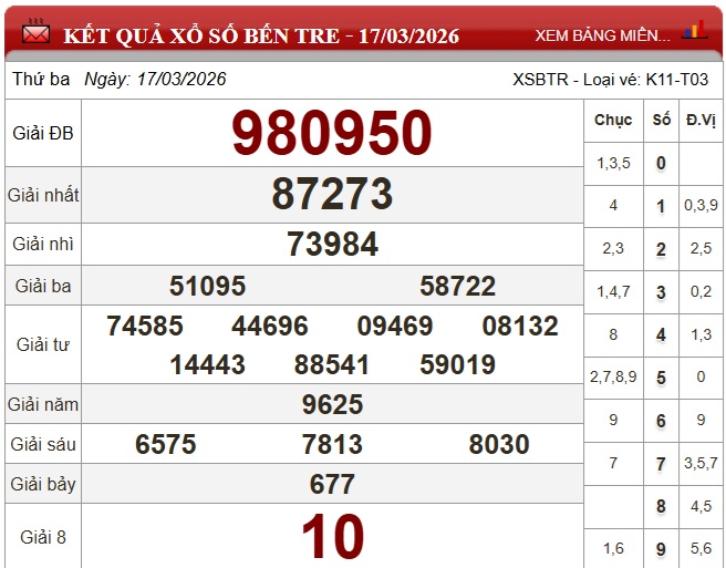 Kết quả xổ số Bến Tre ngày 10/3/2026