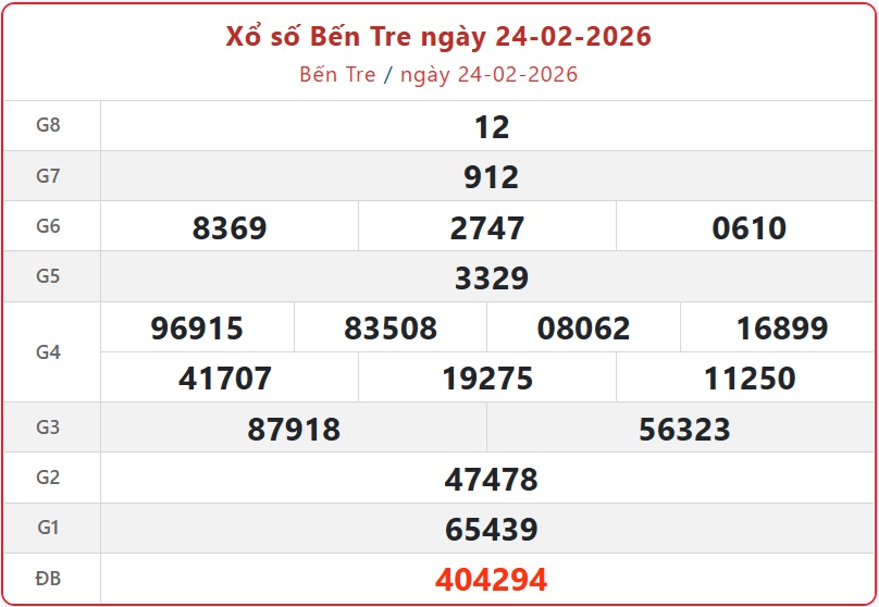 Kết quả xổ số Bến Tre thứ Ba ngày 24/2/2026