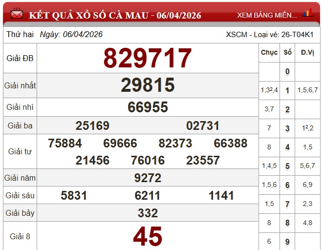 Kết quả xổ số Cà Mau ngày 6/4/2026