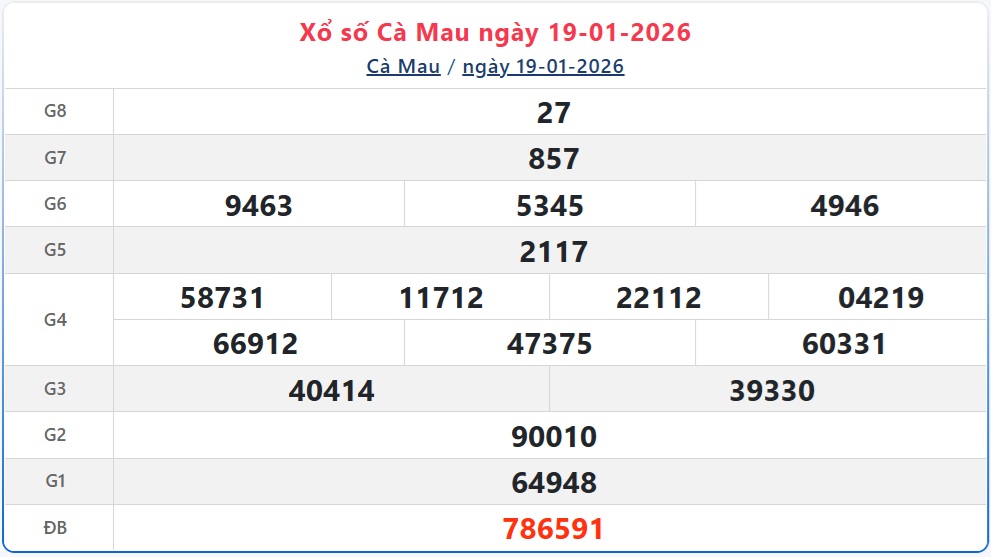Kết quả xổ số Cà Mau thứ Hai ngày 19/1/2026