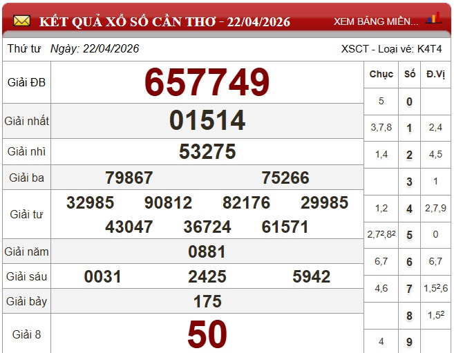Kết quả xổ số Cần Thơ ngày 22/4/2026
