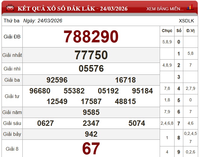 Kết quả xổ số Đắk Lắk Thứ Ba ngày 24/3/2026