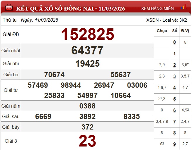 Kết quả xổ số Đồng Nai Thứ Tư ngày 11/3/2026