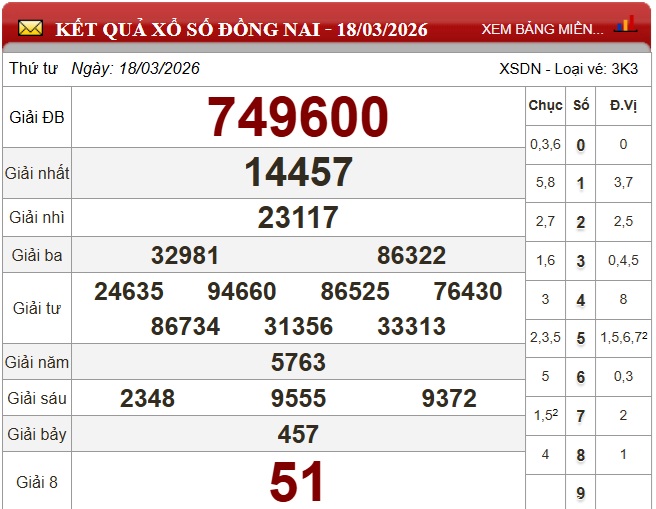 Kết quả xổ số Đồng Nai Thứ Tư ngày 18/3/2026