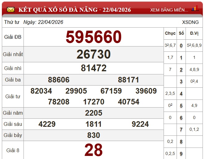 Kết quả xổ số Đà Nẵng ngày 22/4/2026