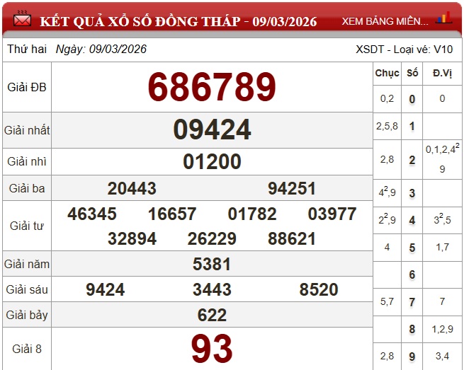 XSDT - Kết quả xổ số Đồng Tháp hôm nay ngày 9/3/2026