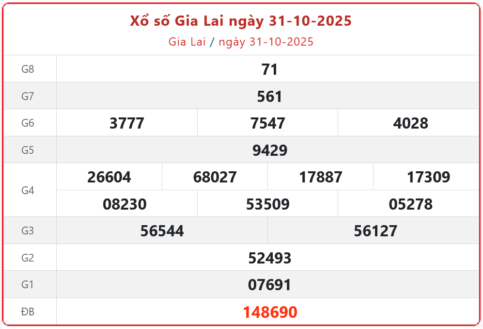 - XSGL 31/10, Kết quả xổ số Gia Lai ngày 31/10/2025
