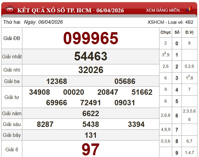 Kết quả xổ số TP.HCM ngày 6/4/2026