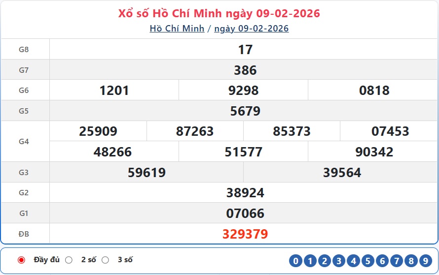 Kết quả xổ số TP.HCM ngày 9/2/2026