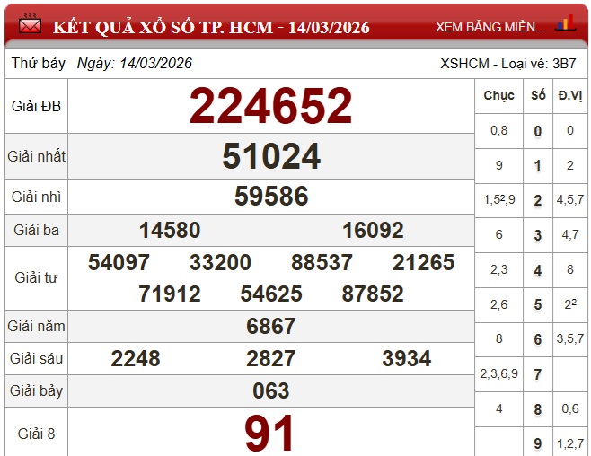 Kết quả xổ số TP.HCM ngày 14/3/2026