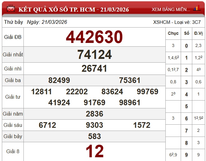Kết quả xổ số TP.HCM ngày 21/3/2026
