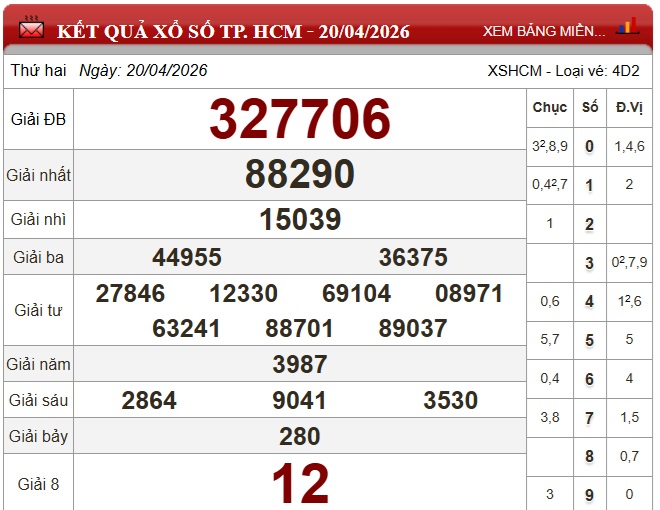 Kết quả xổ số TP.HCM ngày 20/4/2026