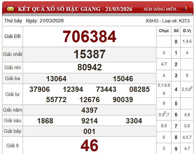 Kết quả xổ số Hậu Giang Thứ Bảy ngày 21/3/2026