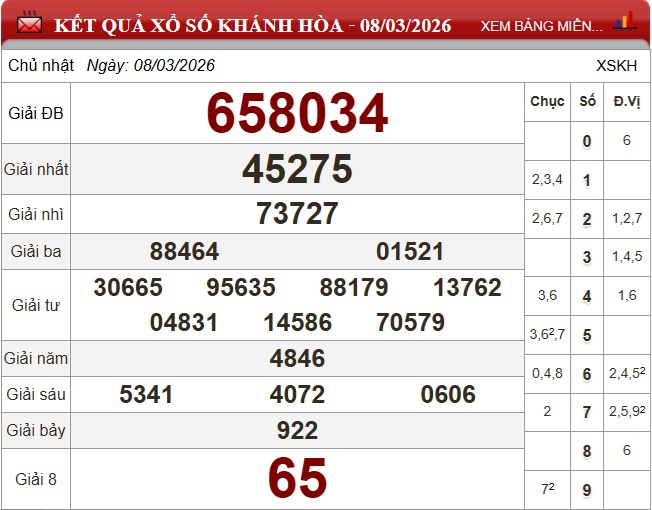 Kết quả xổ số Khánh Hòa ngày 8/3/2026