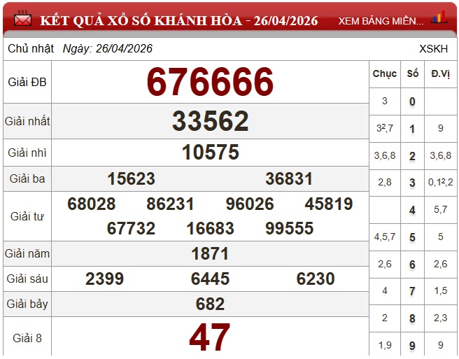 Kết quả xổ số Khánh Hòa ngày 26/4/2026