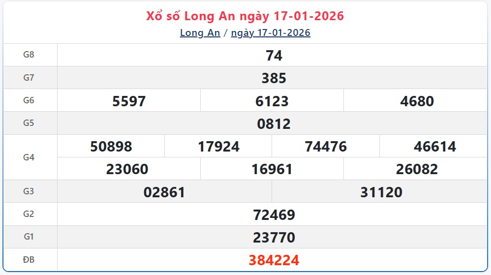 Trực tiếp Kết quả xổ số Long An hôm nay - Kết quả XSLA 17/1 - XSLA hôm nay Thứ Bảy ngày 17/1/2026