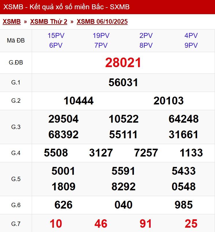 Kết quả xổ số miền Bắc (XSMB) hôm nay ngày 06/10