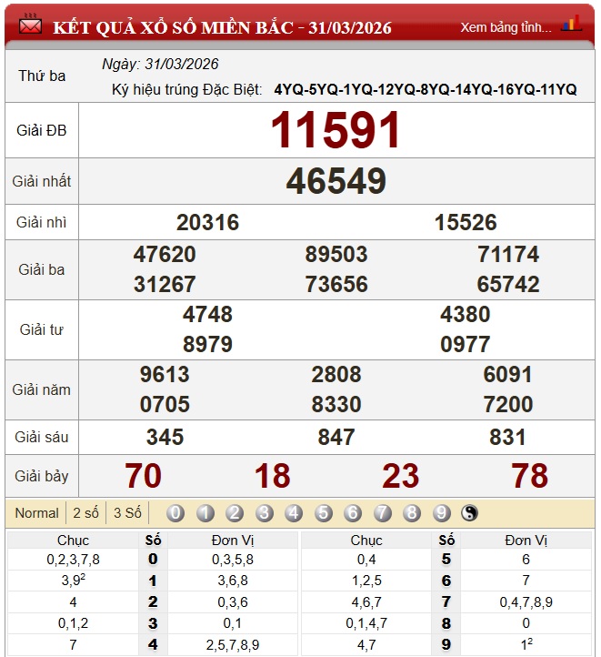 Kết quả xổ số miền Bắc (XSMB) hôm nay ngày 31/3