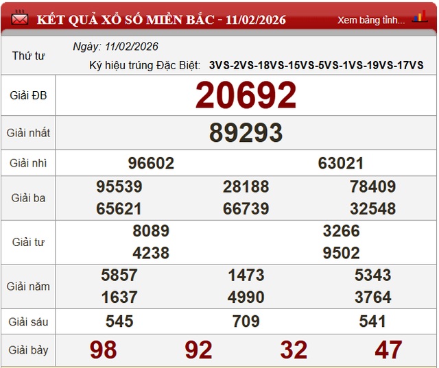 Kết quả Xổ số miền Bắc ngày 11/2/2026