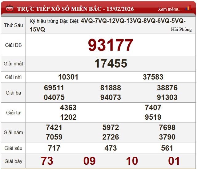 Cập nhật Kết quả xổ số miền Bắc hôm nay 13/02/2026 - XSMB 13/02/2026 nhanh nhất và chính xác nhất.