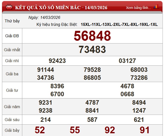 Kết quả Xổ số miền Bắc ngày 14/3/2026