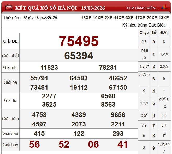Kết quả xổ số miền Bắc (XSMB) hôm nay ngày 19/3