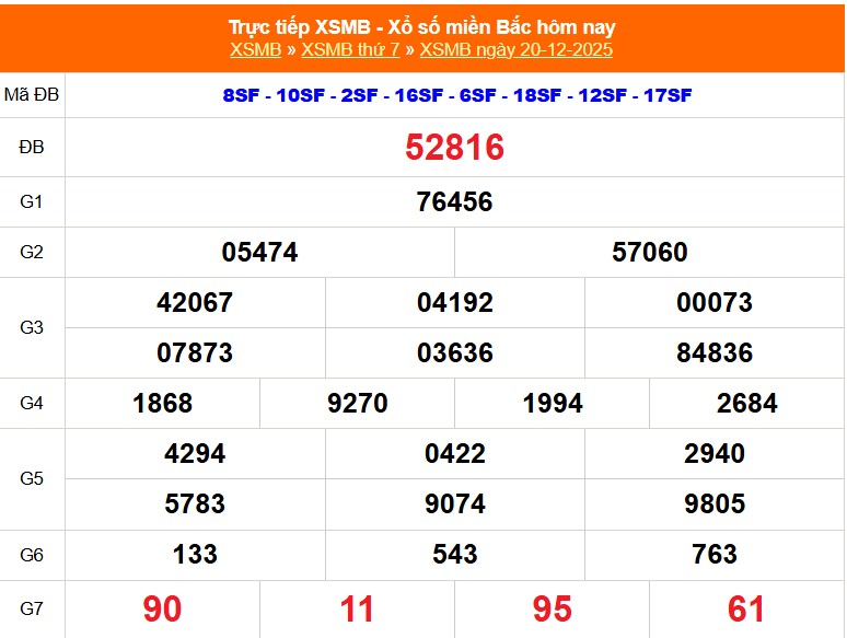 Kết quả Xổ số miền Bắc ngày 20/12/2025