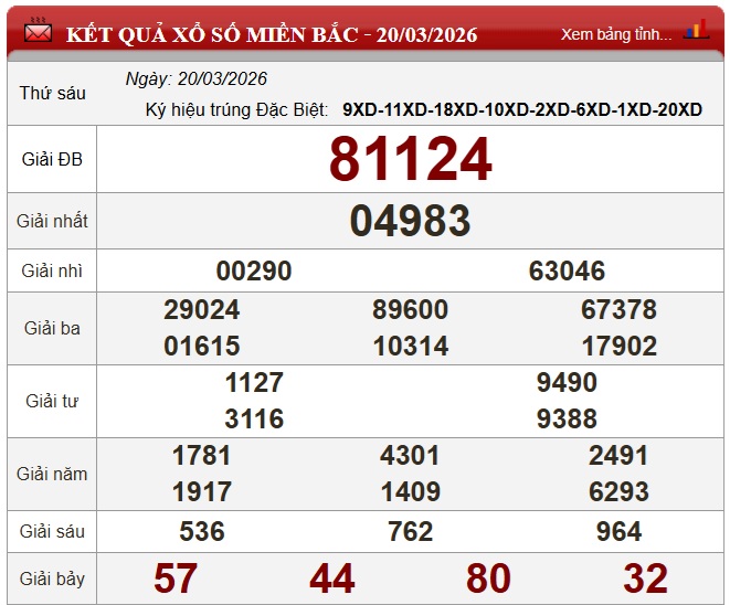 Kết quả xổ số miền Bắc (XSMB) hôm nay ngày 20/3