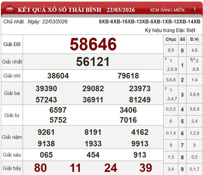 Xem kết quả xổ số trực tuyến hàng tuần. KQXS MB ngày 22/3. Kết quả xổ số miền Bắc ngày 22/3/2026 được quay vào lúc 18h15, bởi Công ty xổ số kiến thiết Thái Bình (XSTB) thưởng lần lượt được công bố từ giải nhất đến giải bảy, cuối cùng là giải đặc biệt.