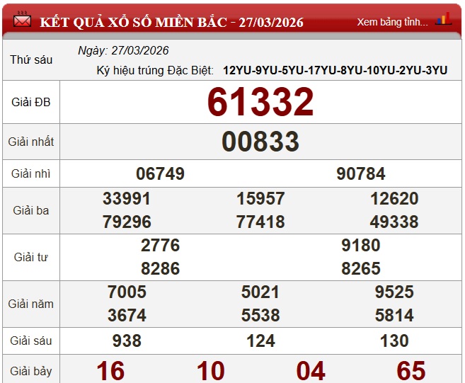 Kết quả xổ số miền Bắc (XSMB) hôm nay ngày 27/3
