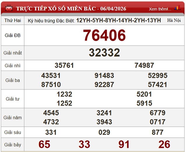 Kết quả xổ số miền Bắc (XSMB) hôm nay ngày 6/4