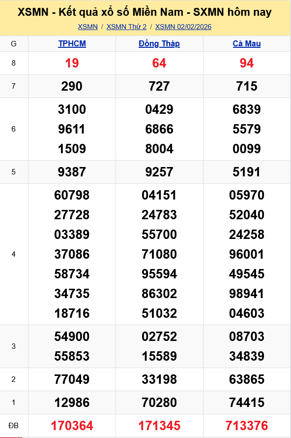 Cập nhật Kết quả xổ số miền Nam hôm nay 02/02/2026 - XSMN 02/02/2026 nhanh nhất và chính xác nhất.